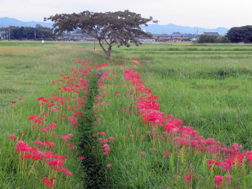 赤く染まった夕空と彼岸花のコラボの風景は、明日香村でも見ることができます。