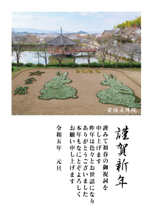 毎年、安倍文珠院のホームページに「ジャンボ干支花絵」を撮影した年賀状が掲載され、自由に使用することができます。ホームページのリンク先を下記に掲載します。