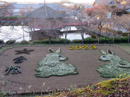 安倍晴明観測地から見る8000株のパンジーで作られたジャンボ干支花絵。来年の干支は、ウサギです。