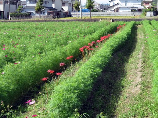 コスモス畑の間に彼岸花が咲いていました。普段見れない風景です。