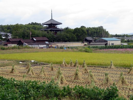 15分弱で、法起寺の三重塔がよく見える場所になります。もう稲刈りが終わり、三角に組んだ稲わらと法起寺の三重塔ののどかな風景が見ることができます。