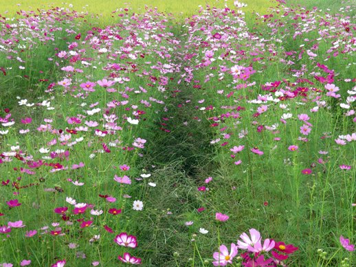 途中のコスモス畑は満開の場所もあり、色とりどりのコスモスが旅人を迎えてくれます。