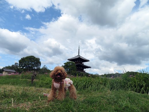 法隆寺と共に世界遺産になった法起寺のコスモスは中宮寺跡に比べて、七分咲きぐらいです。愛犬の後ろにコスモスと三重塔が写るインスタ映えする場所です。