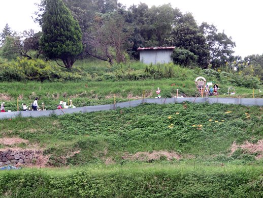 かかしロードの終点の朝風峠の斜面に黄色い彼岸花が咲いていました。写真の右側中央に咲いています。