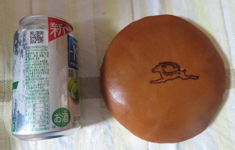 びっくり!高さ約12cmの350ccビール缶より大きい直径約16cmはある三笠まんじゅう!なお、寛永堂の三笠まんじゅうの正式商品名は、「三笠焼」です。
