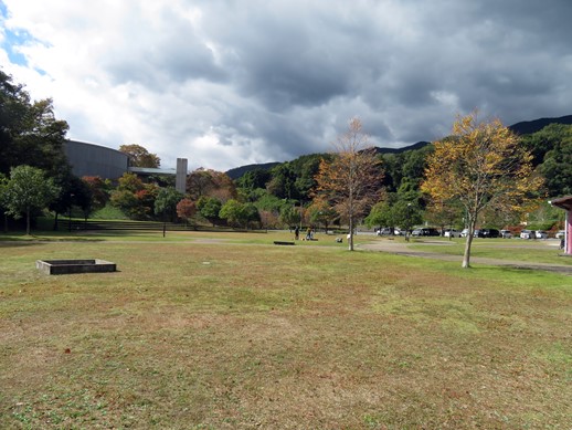 「森のカフェ」のテラスから望める広い広場(「みんなの広場」と言います)!少しづつ木々が色づいてきました。