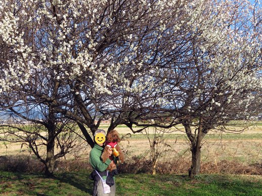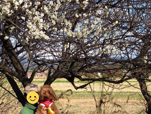 愛犬🐶と白梅。咲いている場所が高いので抱っこで撮影!