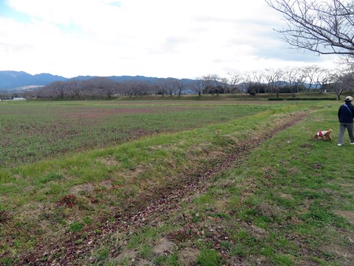藤原宮跡の北にある醍醐池の土手と菜の花畑。数本咲いていますがわかるでしょうか?昨年は3月下旬、満開でした。