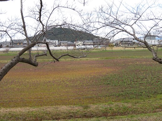 土手から菜の花畑1の風景。奥に望めるのが大和三山の耳成山。まだ、菜の花は見えませんが桜と菜の花の景色はは必見です。