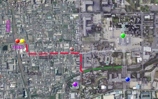親里大路(イチョウ並木)周辺には駐車場が無いため、天理駅周辺の駐車場から天理本通り商店街を歩いて親里大路(イチョウ並木)へ向かう経路をおすすめします。