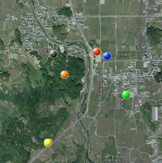 凡例:🟡甘樫丘地区川原駐車場 🟠甘樫丘展望台 ⚫️甘樫丘豊浦休憩所 🔴産直販売あすか夢の楽市 (参考)🔵石上遺跡跡 🟢飛鳥寺