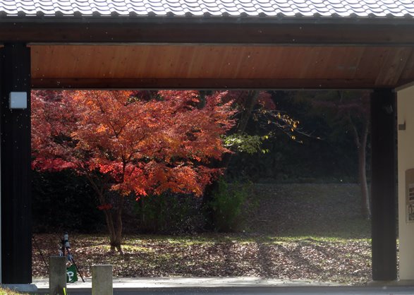 蘇我蝦夷・入鹿父子の邸宅を思わせる豊浦休憩所の入り口から見える紅葉。絵葉書見たいでしょう!