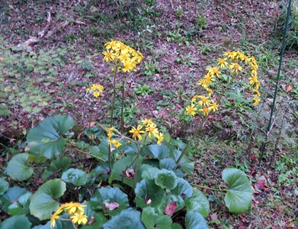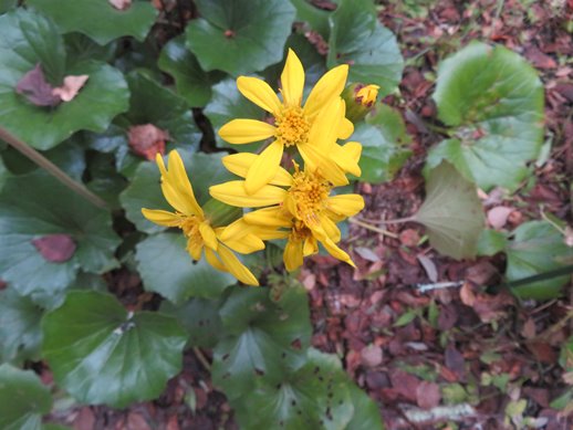 遊歩道の脇に咲く石蕗(ツワブキ)の花。晩秋になると咲き始めることから冬の訪れを告げる花といわれ、俳句の冬の季語でもあります。なお、花言葉は「愛よよみがえれ」で、厳しい冬の中、黄色い花が元気を与えてもらえる事からです。