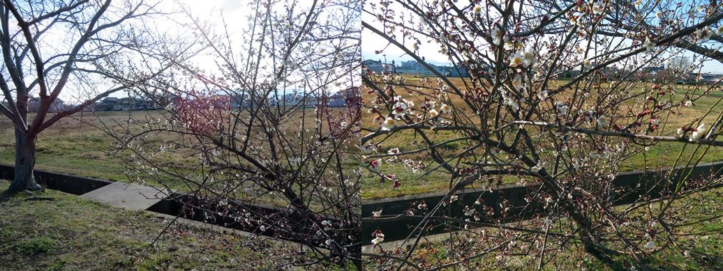 「②菜の花畑西側」のそばに咲く白梅。菜の花より先に白梅が咲き出していました。