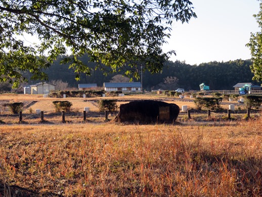 愛犬🐶と伝飛鳥板蓋宮跡(現、飛鳥宮跡)の現風景写真、明日香村の田園の中にたたずむ遺跡。井戸が復元されています。