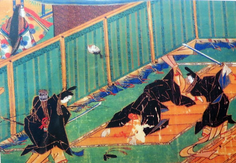 左上は、皇極天皇。左下の弓を持つ武将は中臣鎌足。右は中大兄王子。左中央に蘇我入鹿の首が飛んでいます。なお、切られた首は飛鳥寺付近まで飛び、現在は入鹿の首塚と呼ばれる供養塔が建っています。
