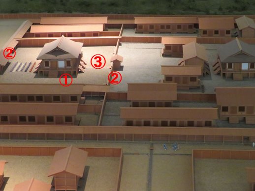 凡例:①「前の写真の③内郭前殿」拡大 ②宮門 ③庭(蘇我入鹿の死体が投げられた場所)