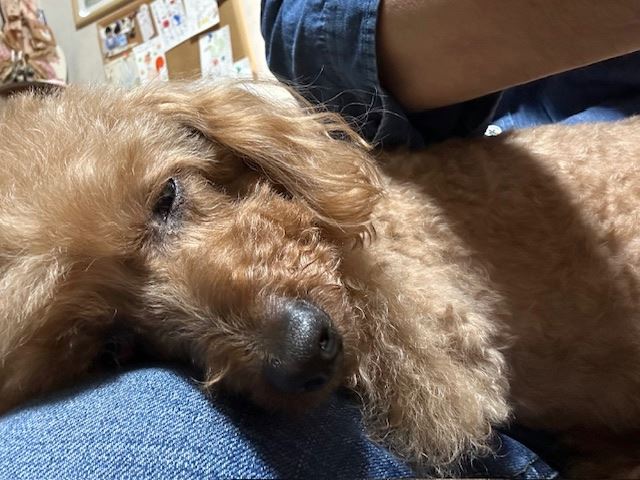 自宅にて(飼い主の膝の上で、置いてかないで🐶)