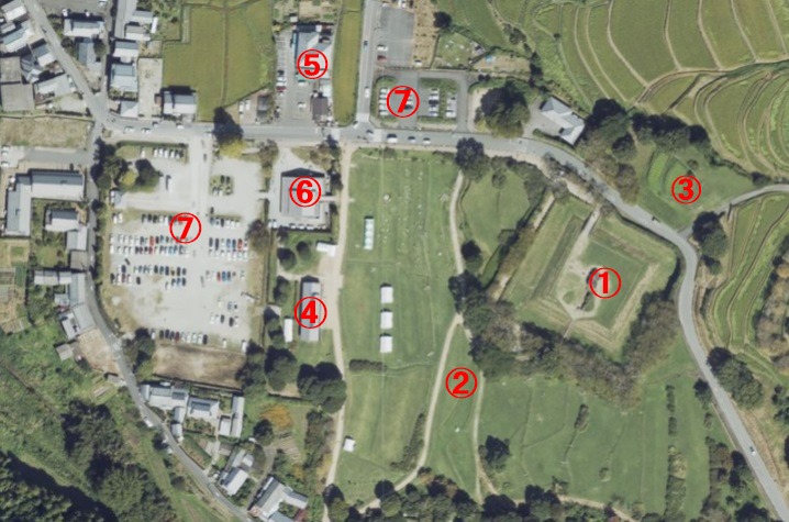 凡例:①石舞台古墳 ②芝生広場 ③石舞台古墳展望台 ④あすか風舞台 ⑤ブランシエラ石舞台テラスーレストラン・テイクアウト&カフェ ⑥明日香の夢市 ⑦駐車場