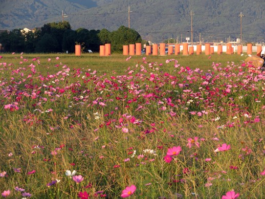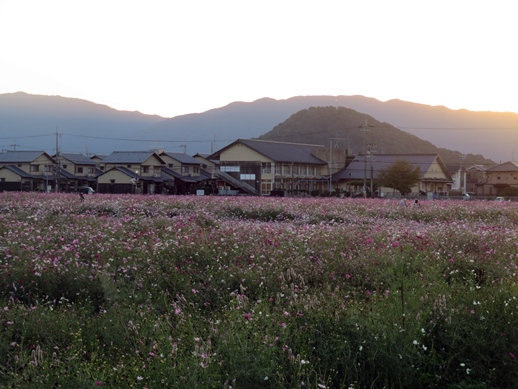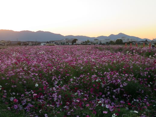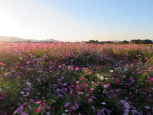 夕暮れが近づき、夕陽が更にコスモスを赤く染まる風景は、おすすめのシャッターチャンスです。