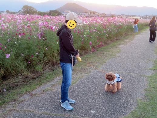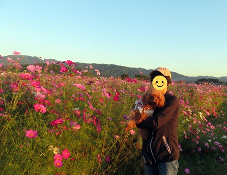 満開のコスモス畑①。ここのコスモス畑は目の高さまで成長していますので、愛犬を抱っこでの撮影がおすすめ。