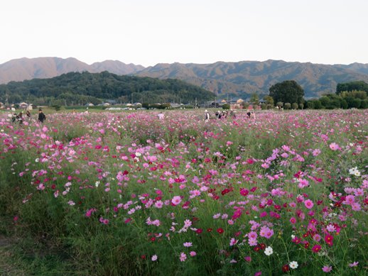 奥に畝傍山が望めコスモスのじゅうたんが広がります。
