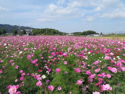 その中でも「中宮寺跡史跡公園」は、秋になると一面に咲き誇るコスモスで知られ、古代の風景と季節の彩りが溶け合う場所。