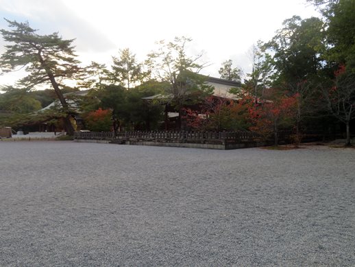 橿原神宮外拝殿前の広場は少し色ずき始めています。例年、12月に入ると、橿原神宮境内の所々で紅葉が赤く彩ります。