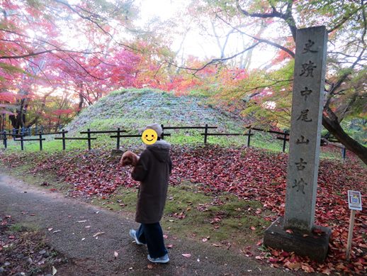 近づいて中尾山古墳を見ると、まるで紅葉の傘が古墳を包み込んでいるようです。